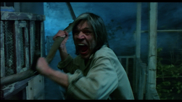 Je découvre le film bien plus tard, au début des années 80, au moment où fleurissent les vidéo-clubs. Sur la jaquette de la cassette, on voit la tête hirsute du personnage, un obscur tenancier d’hôtel, et sa faux surdimensionnée. Le crocodile occupe toute la partie inférieure de l’image, mais finalement on le verra très peu dans le film. On comprend rapidement qu’il n’est qu’un alibi et et qu’il est surtout présent pour attirer le spectateur, sensibilisé aux monstres aquatiques depuis le Jaws de Spielberg.
